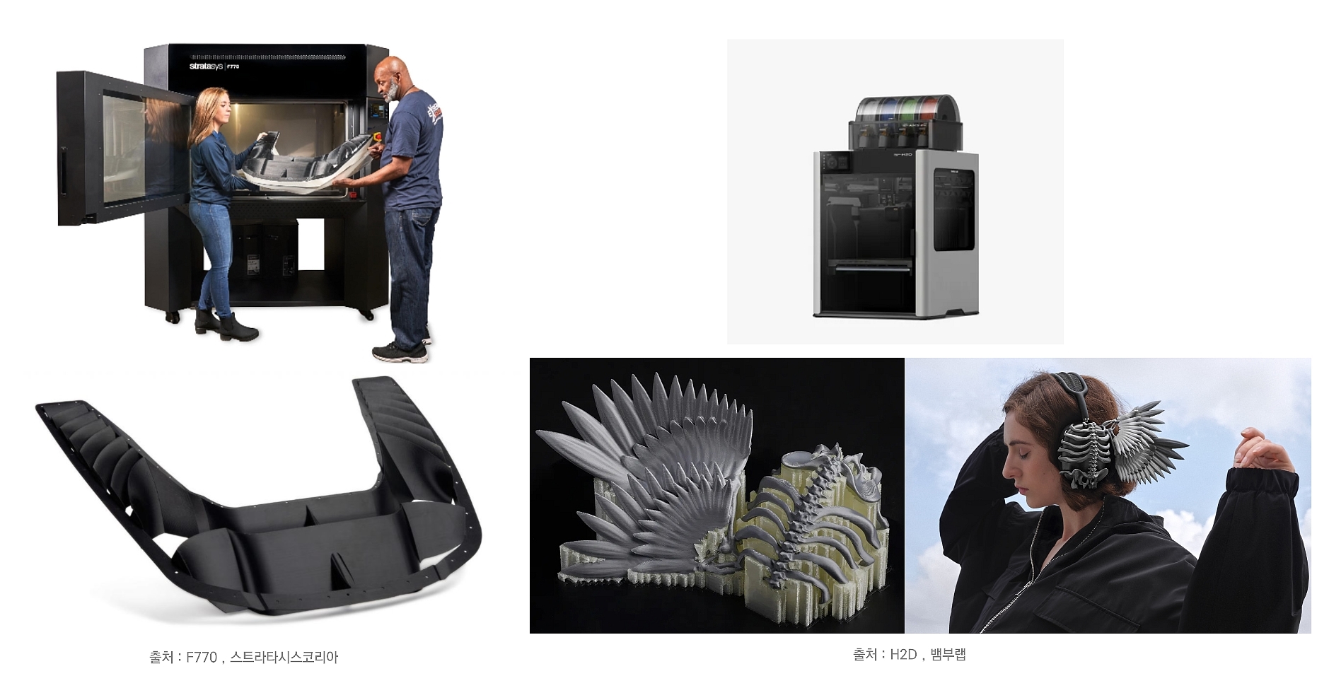 . 자동차 내장재, 조립 검사 지그(Jig) . 항공기 덕트, 고온 내열 부품, 금형 교체용 도구 . 금형 사용없는 최종 사용 목적의 중량 생산 부품 |